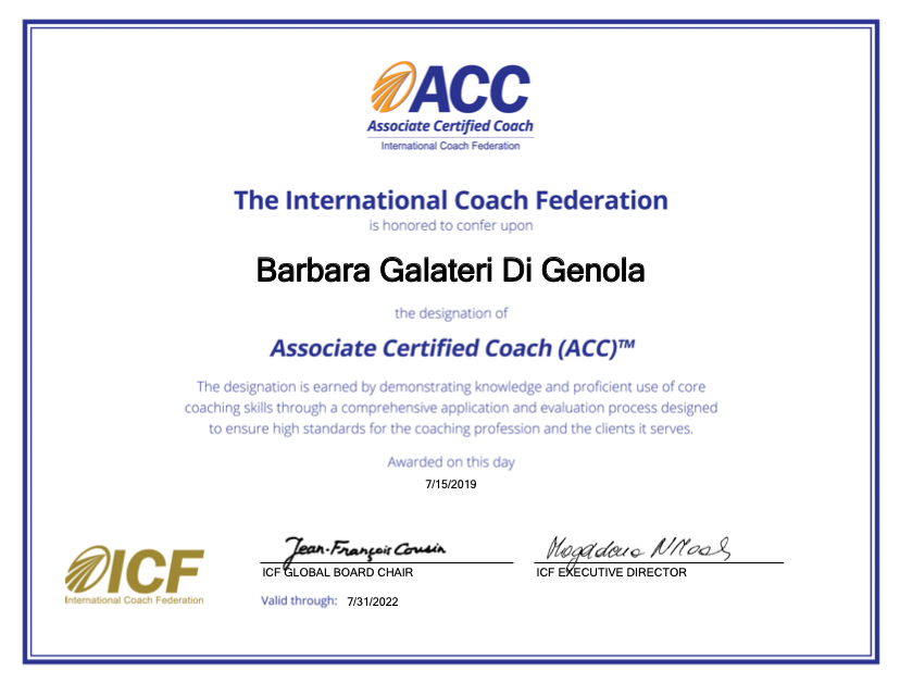 - 2019 – Conseguimento credenziale ACC (Associate Certified Coach)